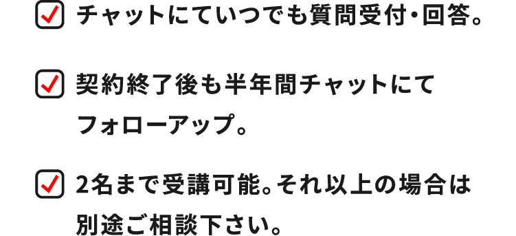 受講完了後も6ヶ月間はチャットでサポートいたしますので、ご安心ください。 その後も必要に応じて対応いたしますので、いつでもご相談ください。