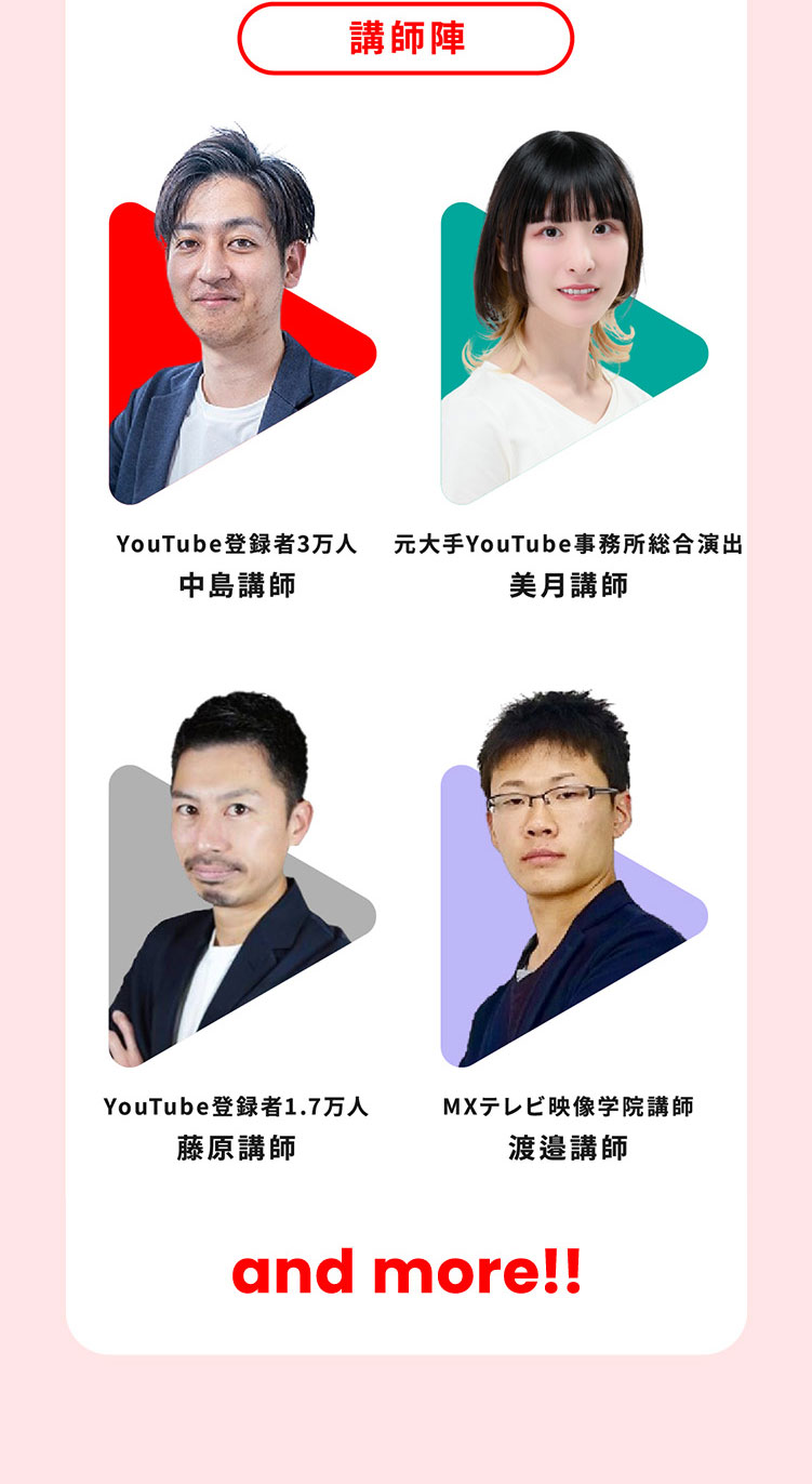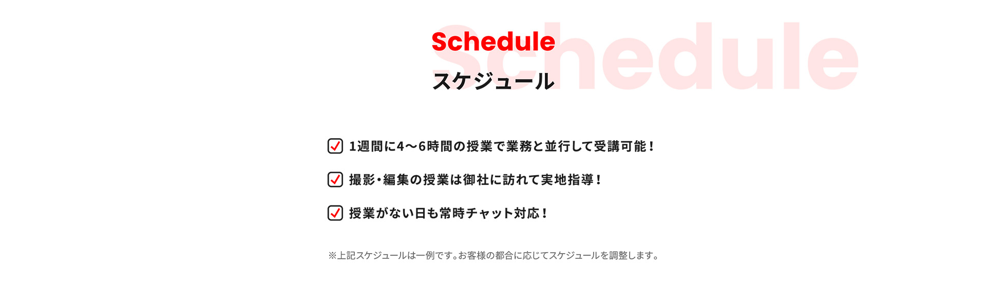 ・撮影機材の購入、編集ソフトの使用料などは含まれておりませんので、必要に応じてお支払いをお願いします。