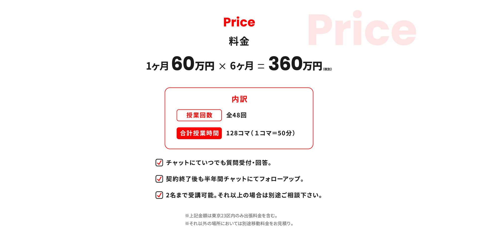 ・基本的にはお客様の会社内で教育することを前提としているため、それが難しい場合貸スペースなどの費用が発生します。