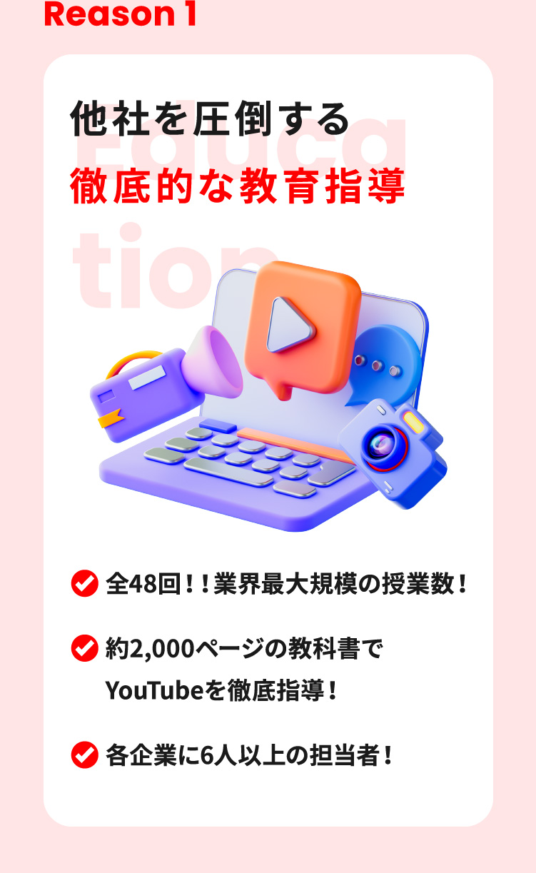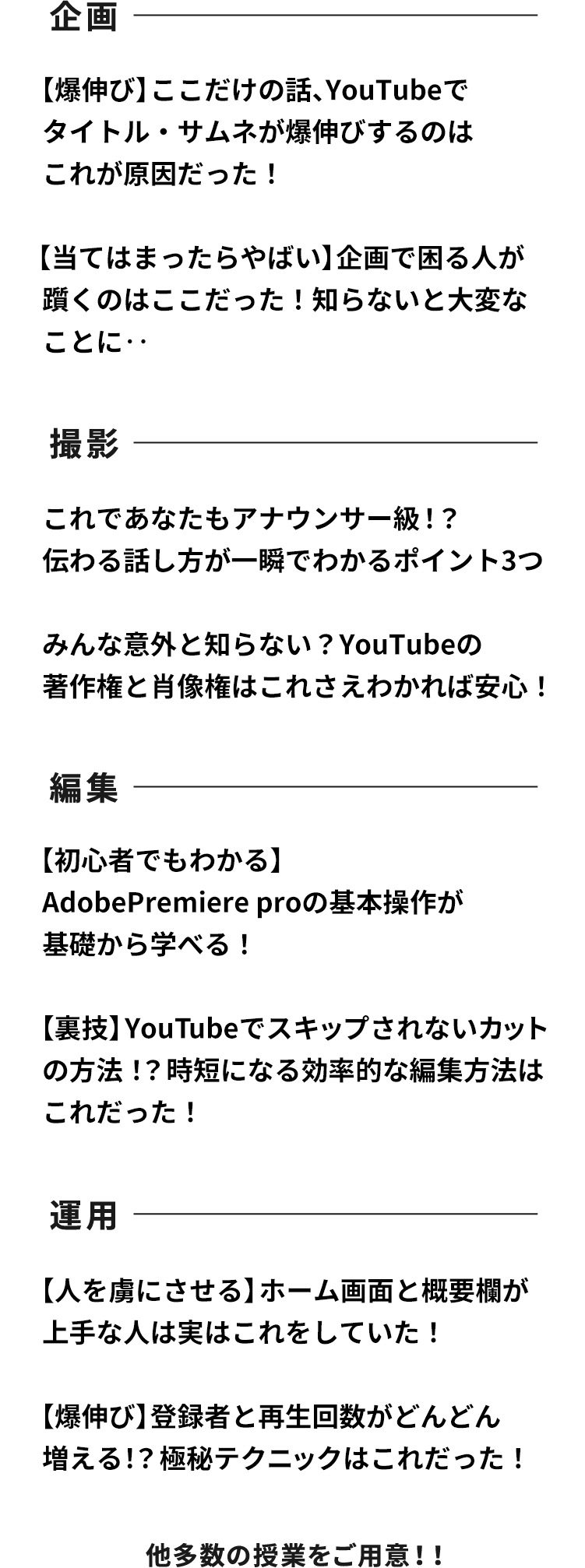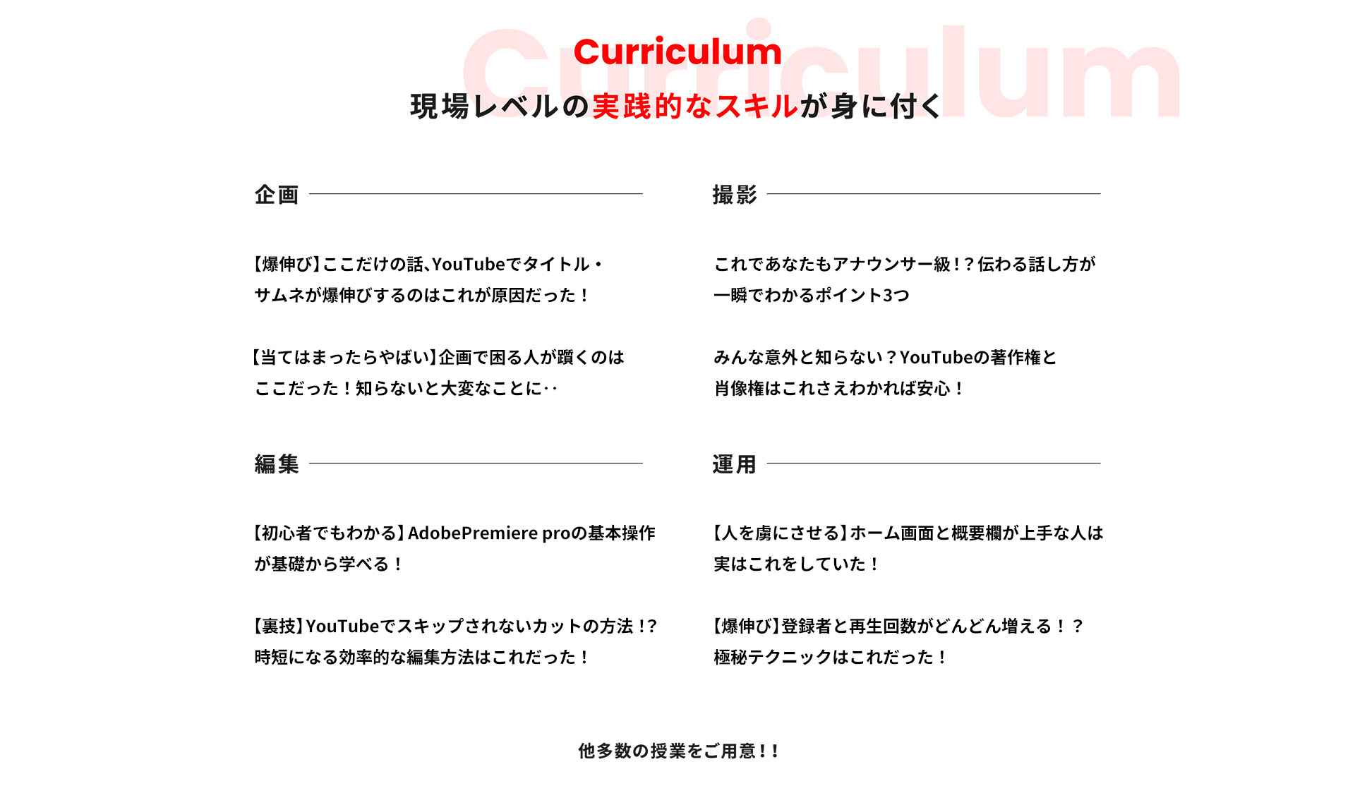 今のところはYouTube以外の教育カリキュラムは用意しておりません。今後ご要望が多い場合開設を検討したいと思います。 なお、私たちは様々な種類のSNSに取り組んでいますが、YouTubeが最も難しいSNSであることは間違いありません。 そのため、YouTubeをマスターすることができれば、他のSNSにも応用が効くと考えています。